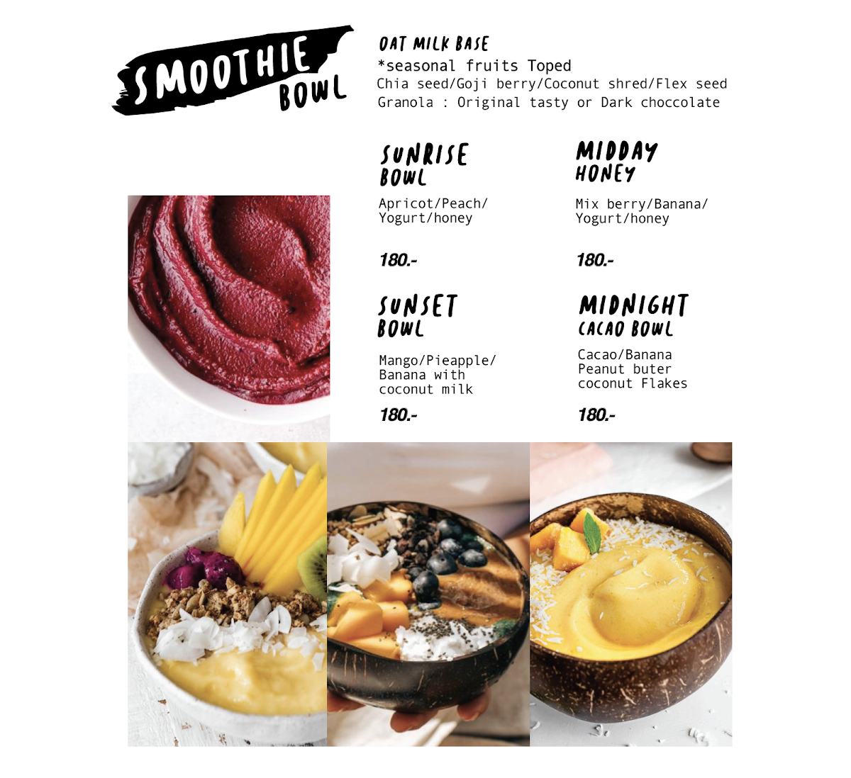 Cacao,Banana base with oat milk / seasonal fruits / Peanut butter/ Granola/ Dark chocolate